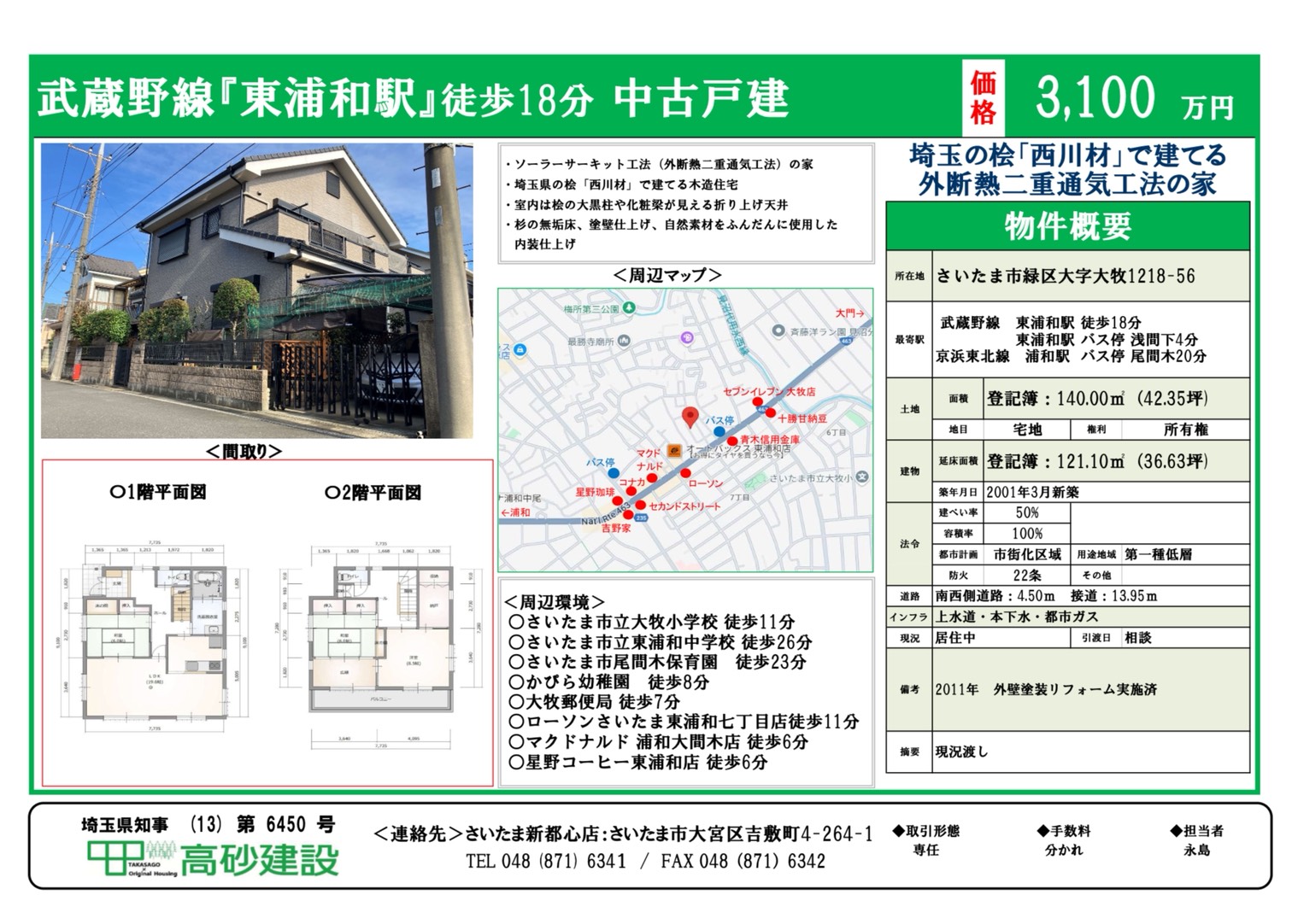 | 交通 | JR武蔵野線東浦和駅 徒歩20分 JR京浜東北・根岸線浦和駅 バス(尾間木 乗20分) |